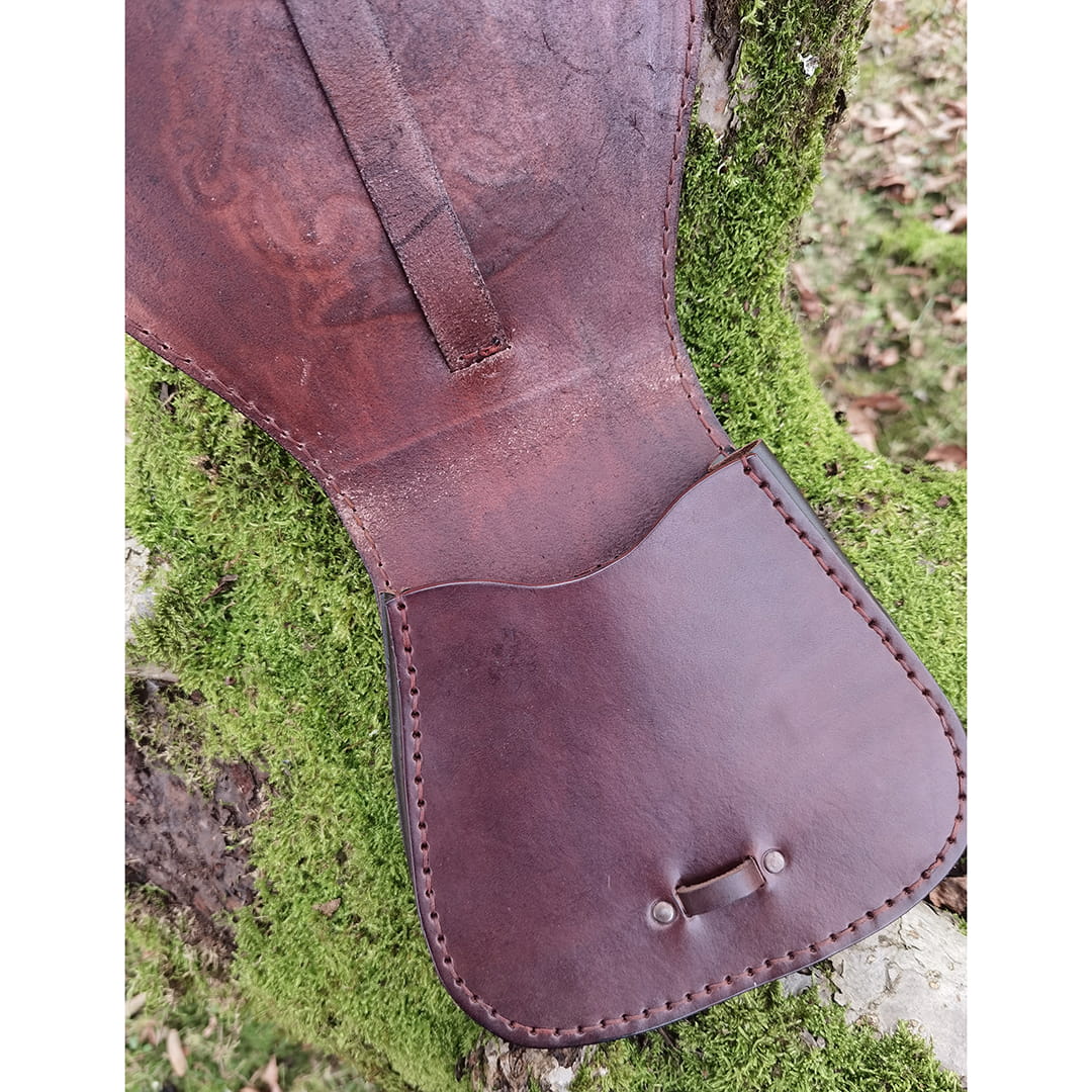 - Sakwa wykonana jest z wysokiej jakości bydlęcej skóry juchtowej, zafarbowana odpowiednimi garbnikami i zaimpregnowana dla uzyskania odporności na odbarwianie oraz czynniki atmosferyczne