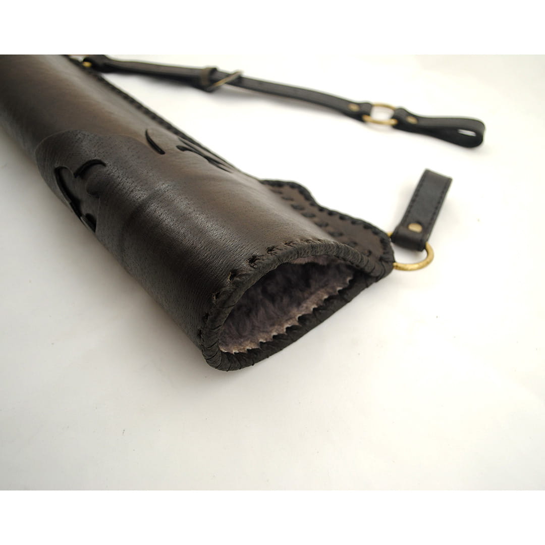 - Ręczne zdobienia nadają niepowtarzalność. Góra kołczanu jest ozdobiona skórzanym kołnierzem z wyciętymi kształtami lilii
