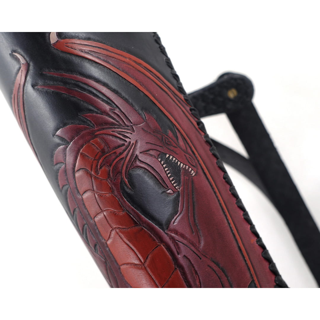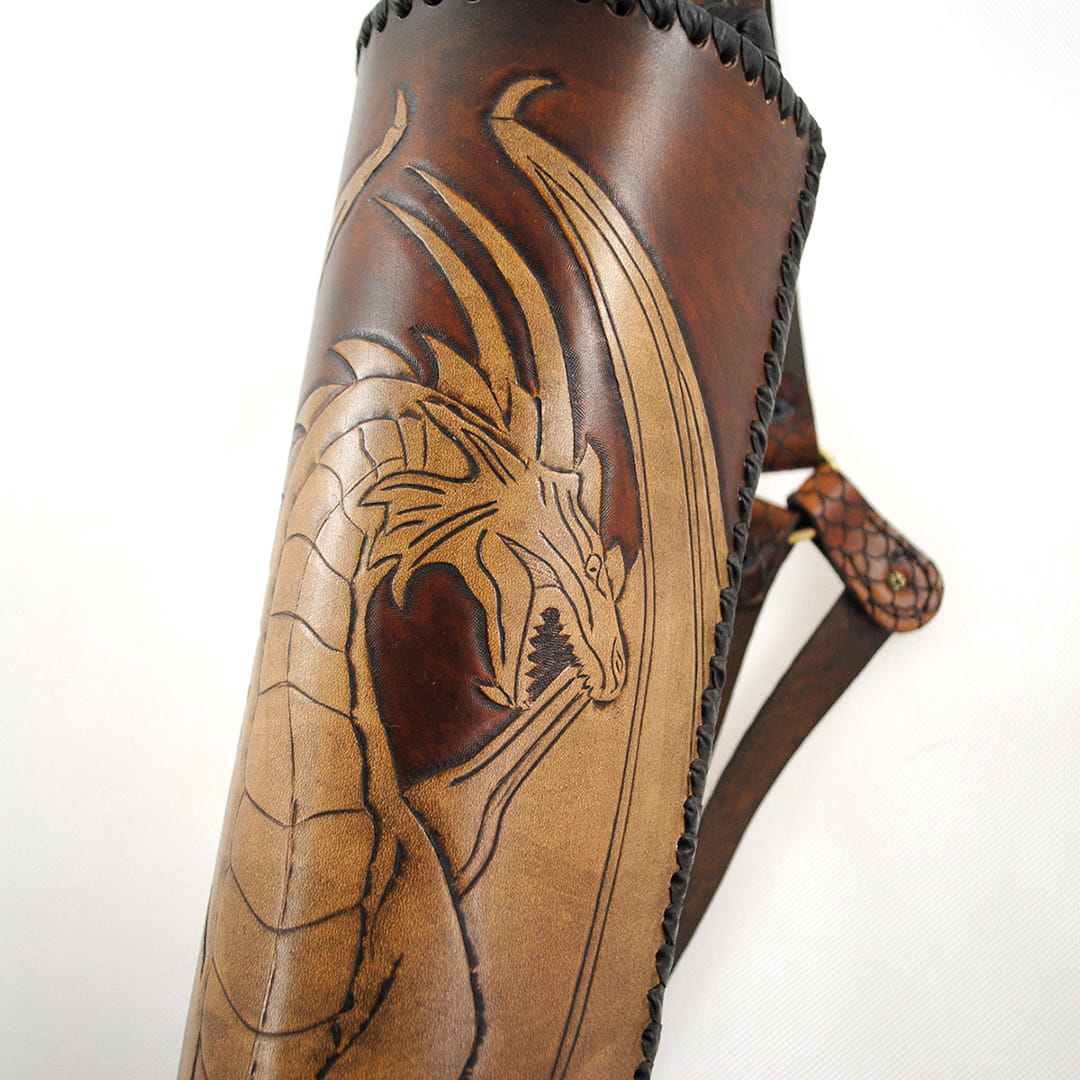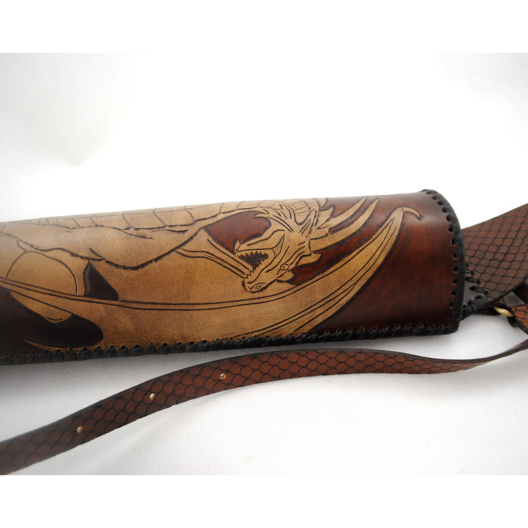 - Wyjątkowa estetyka wykonanego ręcznie zdobienia. Ten kołczan ozdobiony jest motywem smoka. Całość zdobienia to ręczna praca
