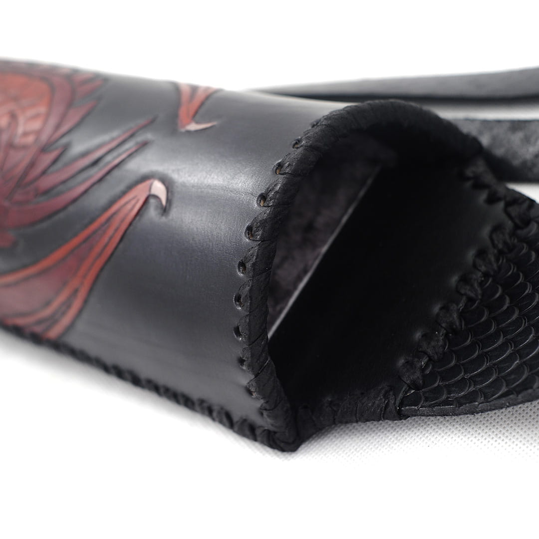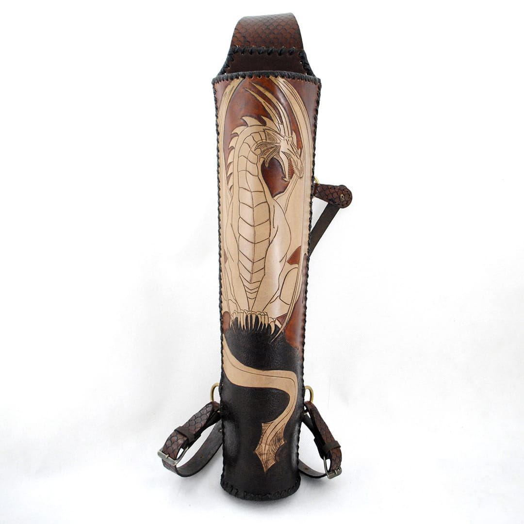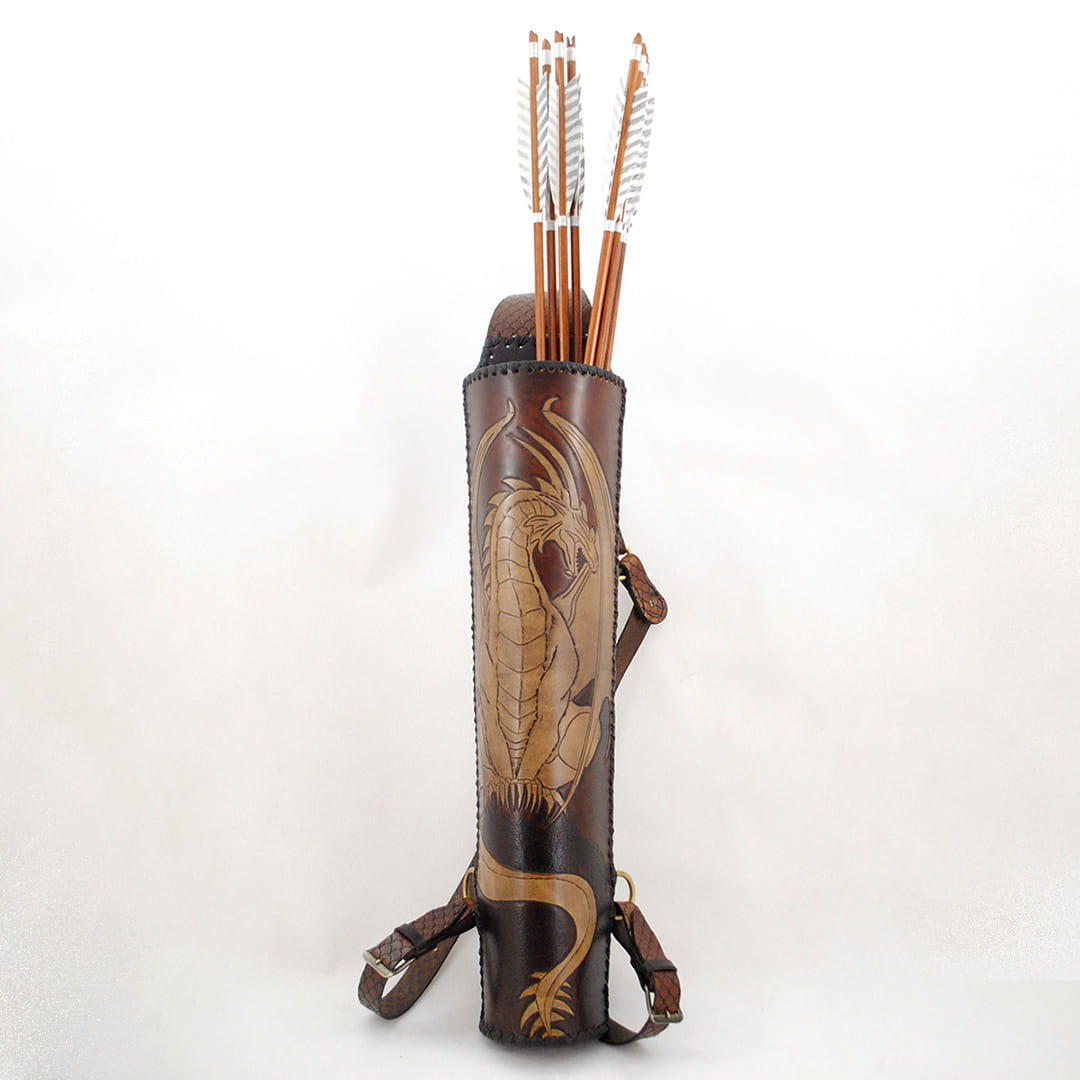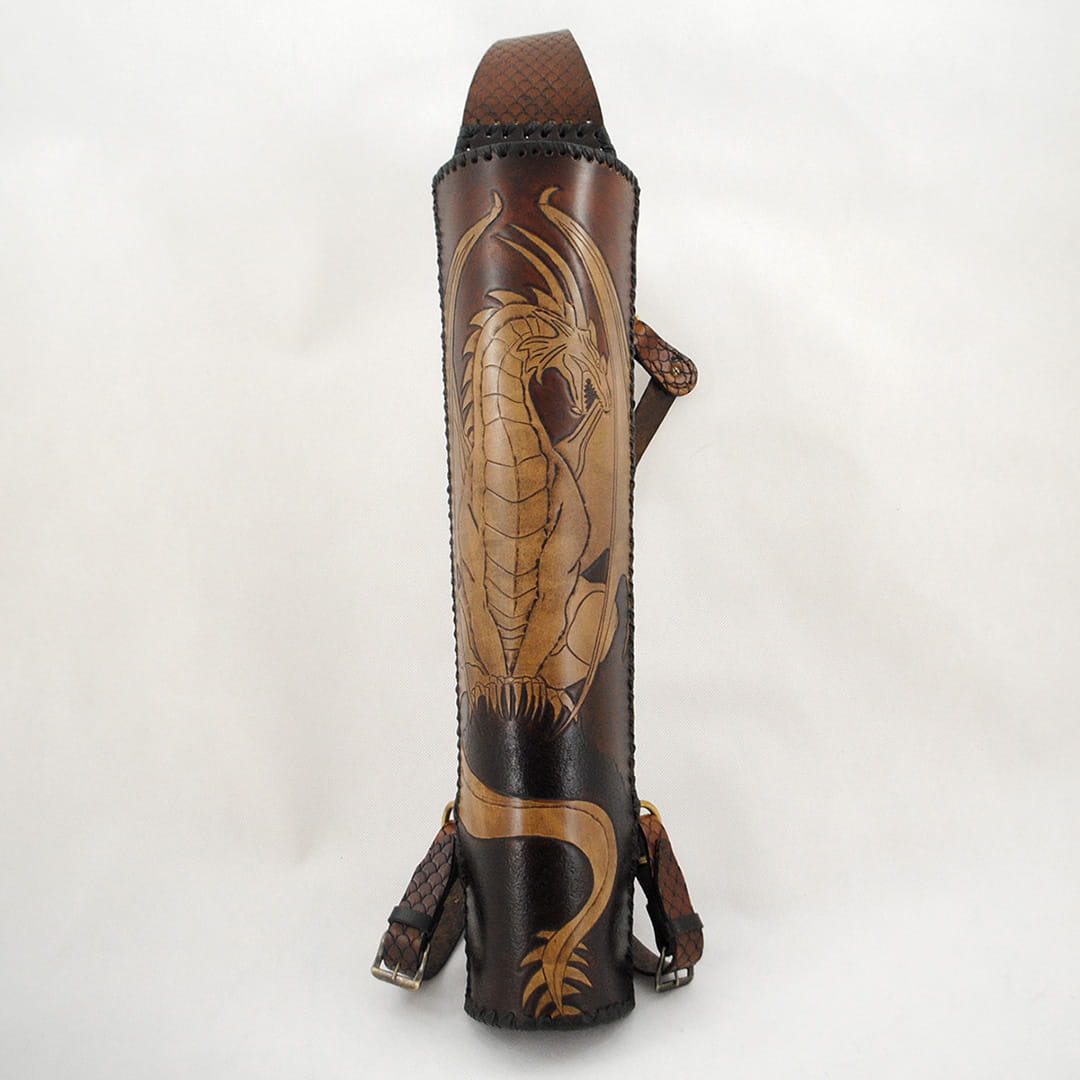 - Wyjątkowa estetyka wykonanego ręcznie zdobienia. Ten kołczan ozdobiony jest motywem smoka. Całość zdobienia to ręczna praca