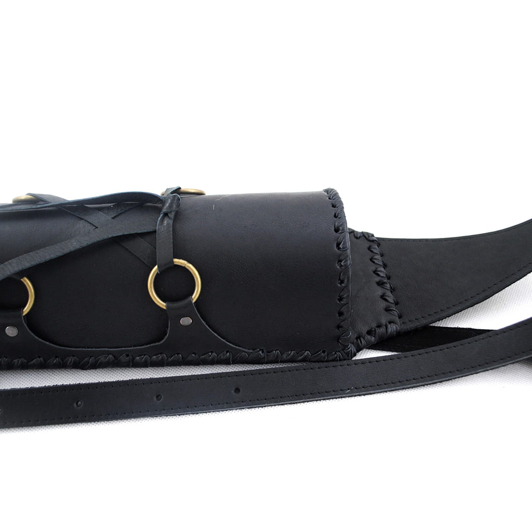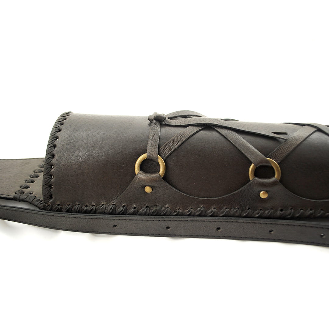 • Przód kołczanu ozdobiony został pierścieniami z przewiązanym przez nie szerokim rzemieniem