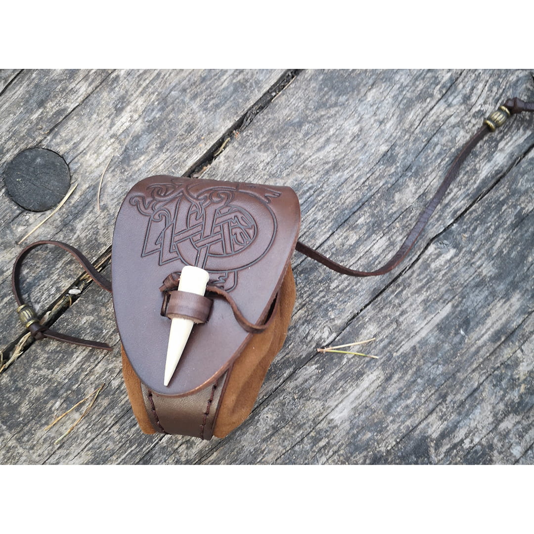 Mieszek wykonany jest z zamszu i skóry juchtowej. Zdobiona klapka skórzana nadaje mieszkowi pożądany kształt i uławia otwieranie i zamykanie. Zatyczka z poroża gwarantuje bezpieczeństwo zamykania.