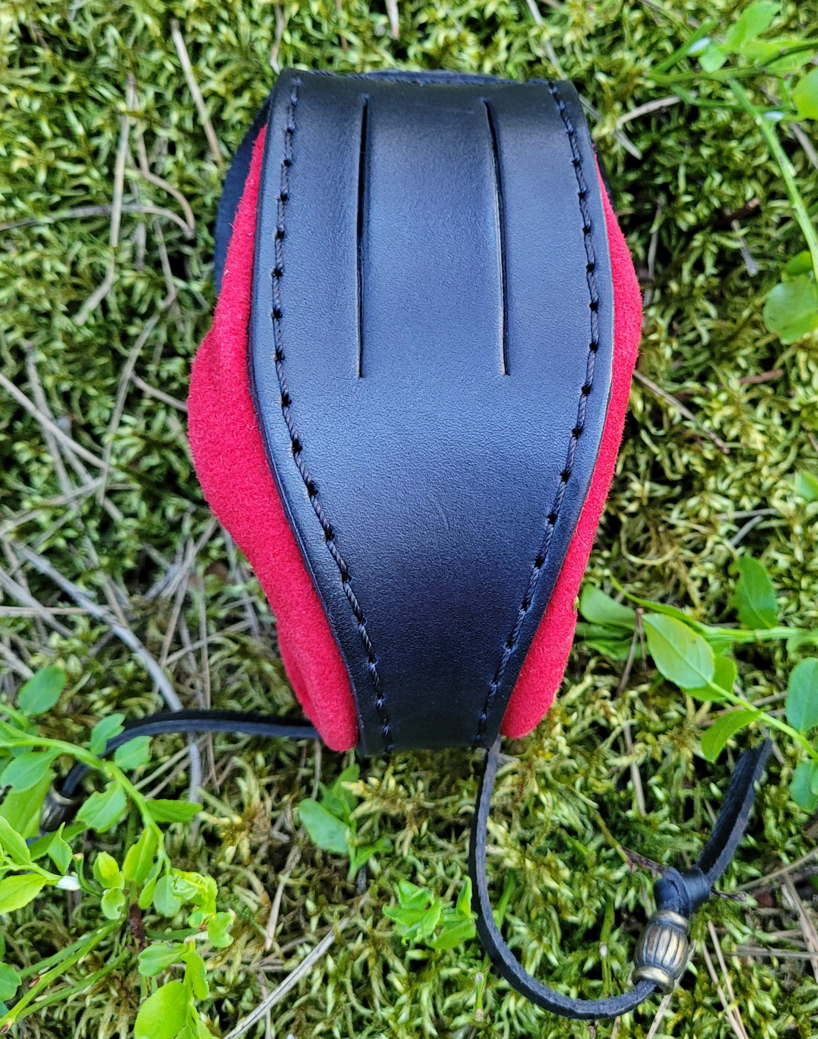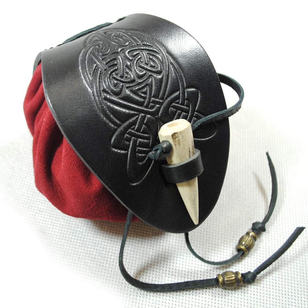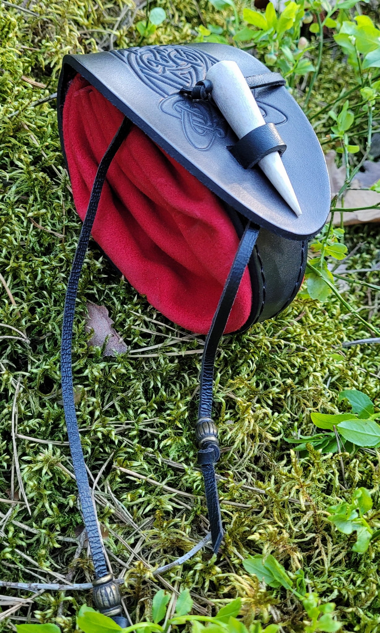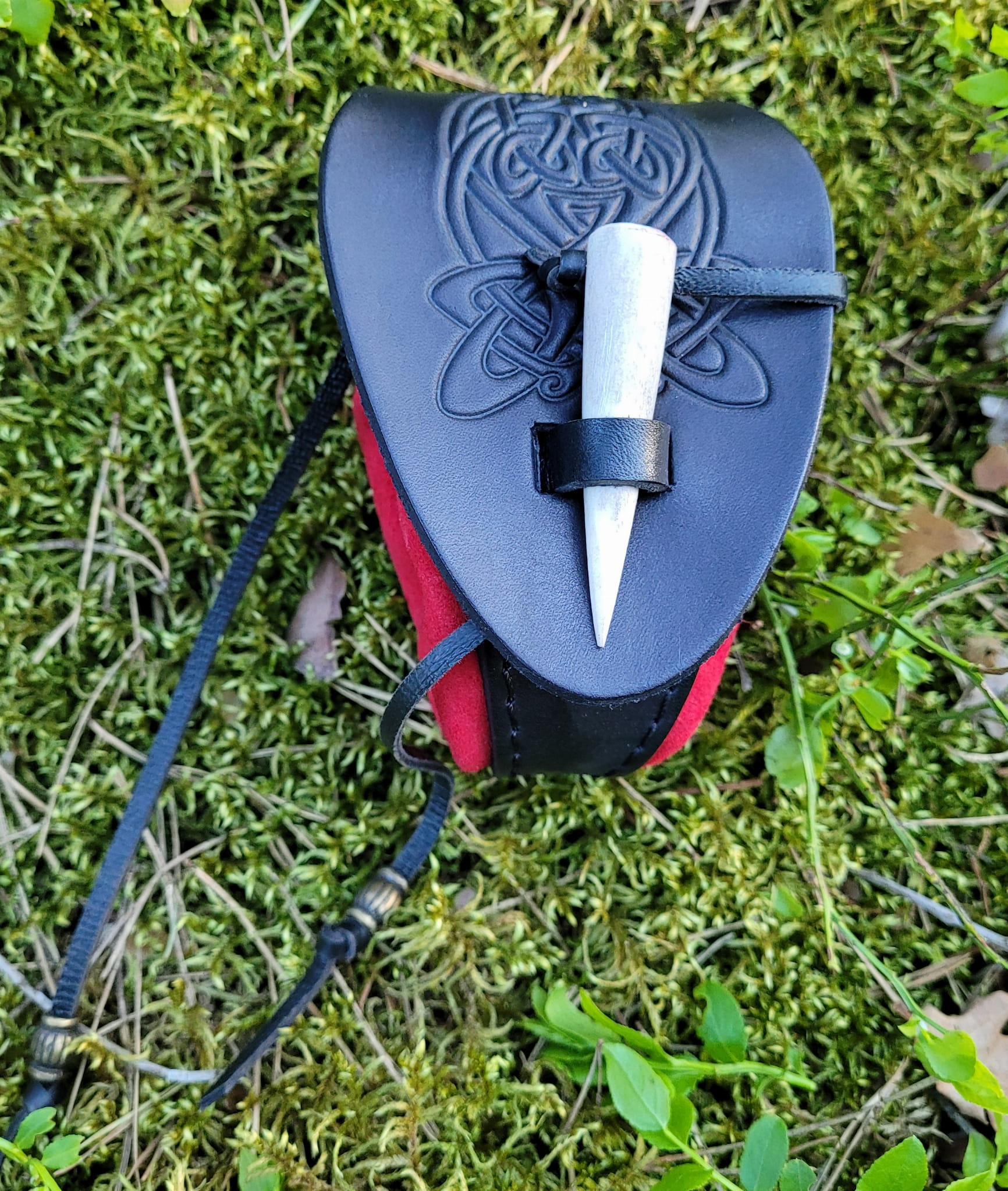 Mieszek wykonany jest z zamszu i skóry juchtowej. Zdobiona klapka skórzana nadaje mieszkowi pożądany kształt i uławia otwieranie i zamykanie. Zatyczka z poroża gwarantuje bezpieczeństwo zamykania.