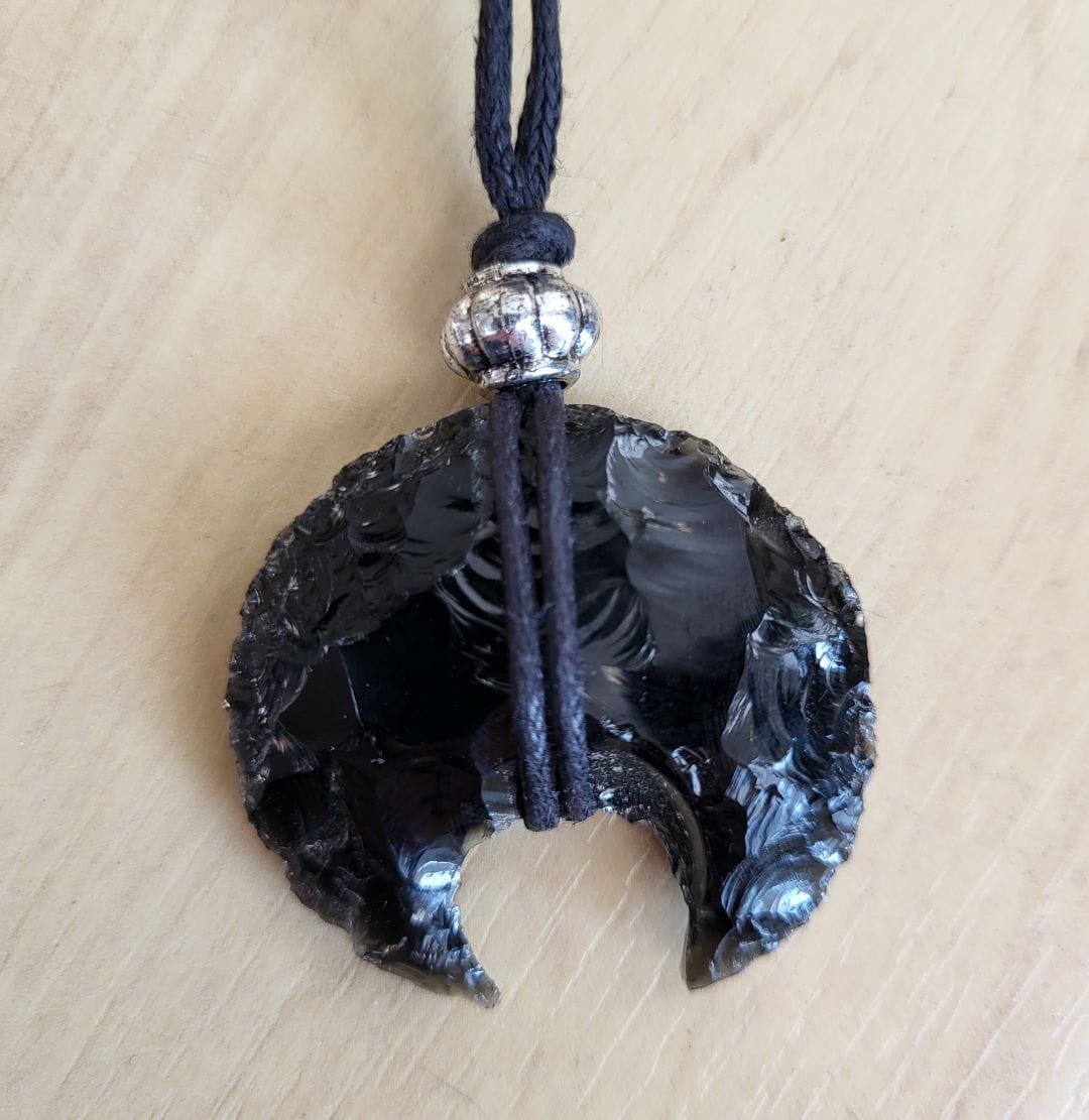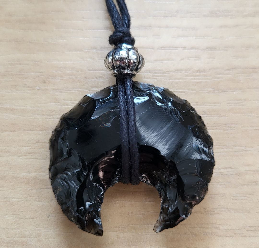 Ręcznie wykonany wisiorek z obsydianu w kształcie lunuli.